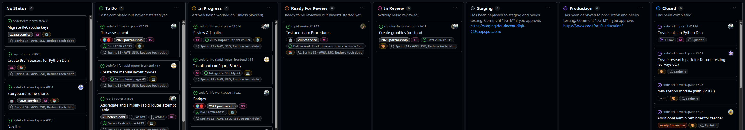 5. [**Staging**](#id-6.-staging) - Has been deployed to staging and needs testing.